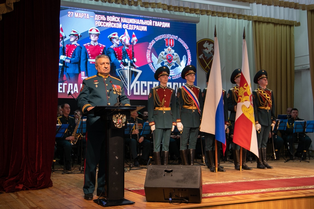 В своем выступлении командующий Приволжским ордена Жукова округом войск национальной гвардии Российской Федерации генерал-полковник Сергей Просяник отметил, что с созданием Росгвардии началась новая глава в истории войск правопорядка, которые являются важным звеном системы безопасности нашего государства. Войска всегда твердо стояли на защите Родины, были и остаются ее надежной опорой. «Сегодня мы налаживаем мирную жизнь на воссоединенных территориях, продолжая обеспечивать государственную и общественную безопасность. Помимо выполнения задач в ходе специальной военной операции, личный состав обеспечивает правопорядок на территории Приволжского федерального округа. Со дня образования Росгвардии за проявленные мужество и героизм военнослужащие и сотрудники округа удостоены 3 000 государственных и более 6 000 ведомственных наград», – отметил генерал-полковник Сергей Просяник.