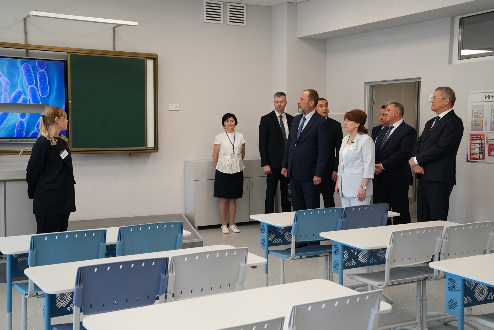Во время осмотра школы Игорь Комаров и Радий Хабиров посетили кабинет биологии и лаборатории, где ребята занимаются исследованиями на современном оборудовании, кабинеты начальных классов, рисования и графики, актовый и спортивный залы.