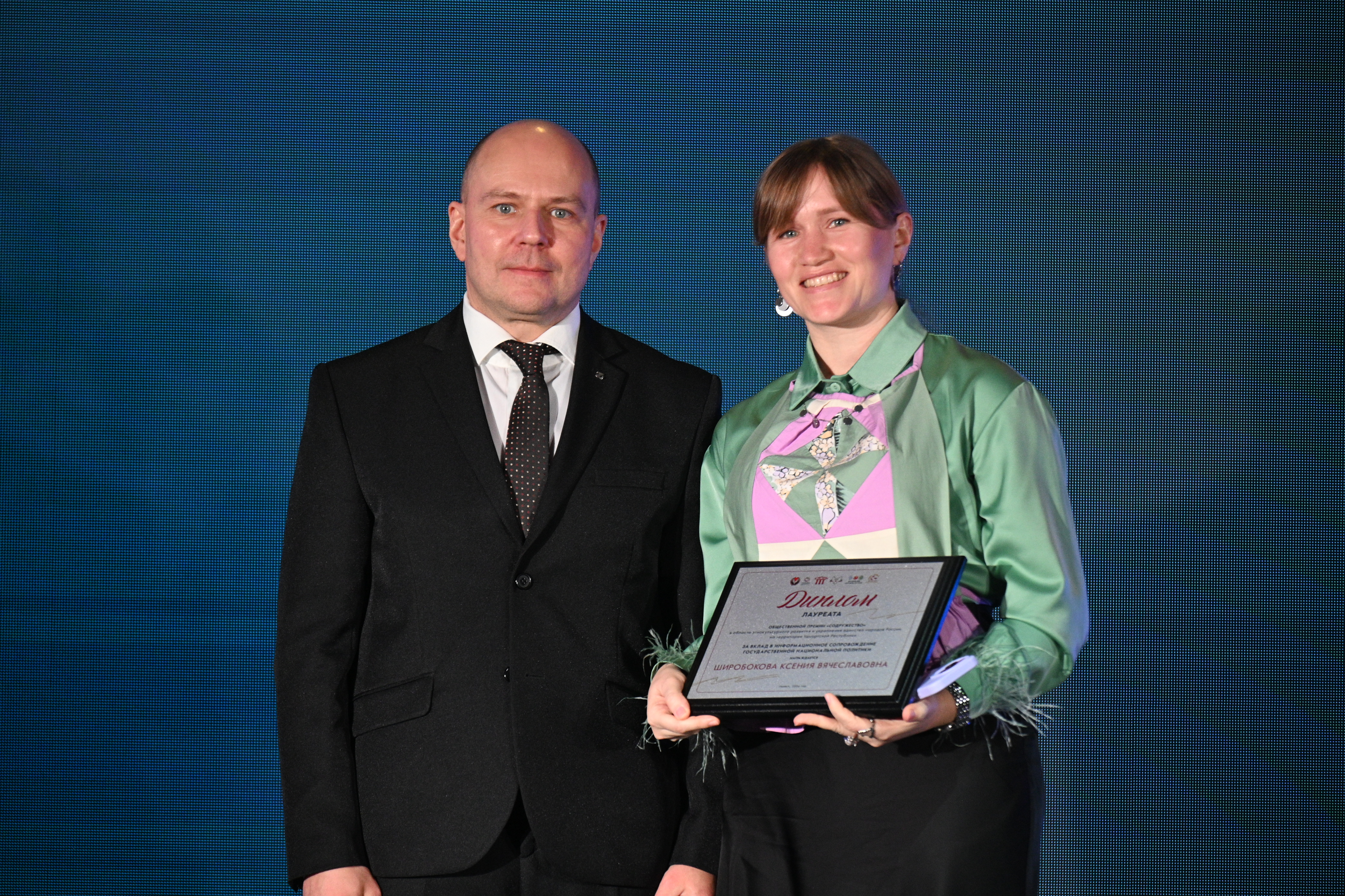 Главный федеральный инспектор по Удмуртской Республике Алексей Воробьев выступил с приветственным словом и наградил лауреатов Общественной премии в номинации «За вклад в информационное сопровождение государственной национальной политики». В своем выступлении он отметил: «Более 87 % жителей Удмуртии положительно оценивают состояние межэтнических отношений — это выше общероссийского показателя. Такой результат — прямое свидетельство слаженной работы органов власти, общественных организаций и национальных объединений. Республика демонстрирует пример эффективного партнерства государства и общества в деле укрепления единства нашей страны».