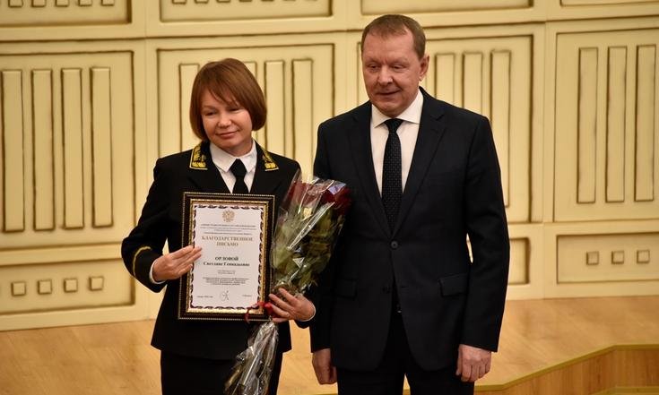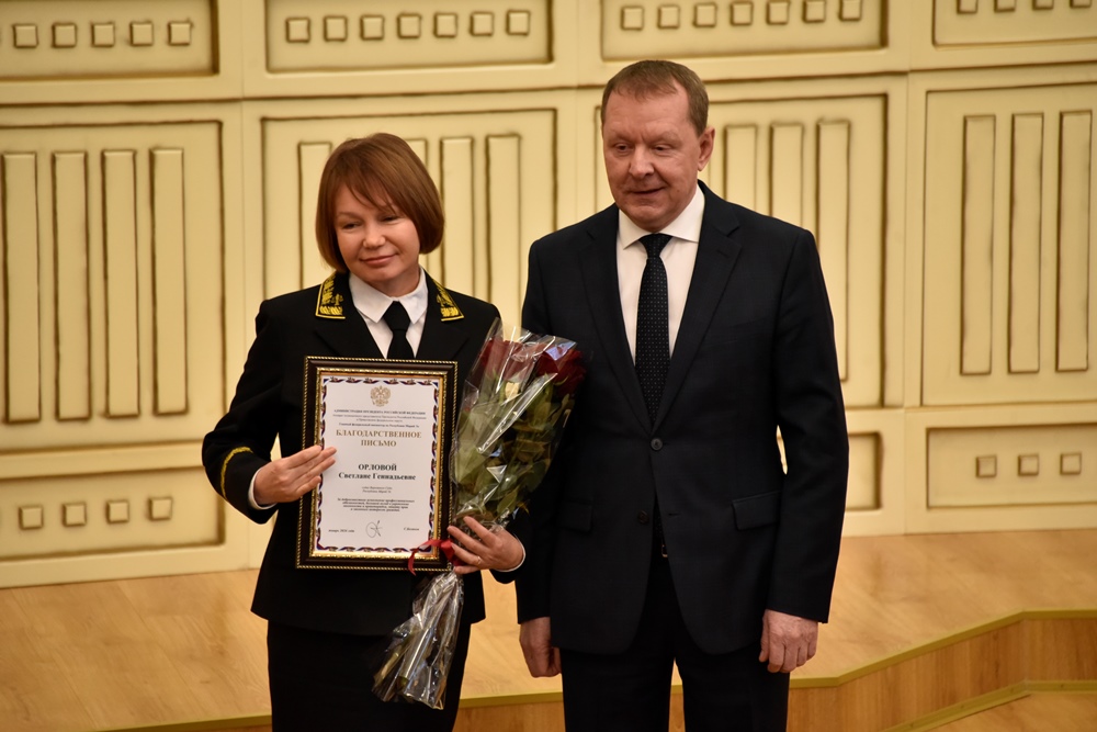 Выразив признательность судейскому корпусу за труд с полной самоотдачей и преданность своему делу и пожелав участникам совещания здоровья и успехов в деле служения правосудию, Сергей Беляков вручил за большой личный вклад в укрепление законности и правопорядка в Марий Эл благодарственные письма главного федерального инспектора судье Верховного Суда республики Светлане Орловой, судье Сернурского районного суда Элине Игнатьевой и мировому судье Советского судебного района Марий Эл Тимуру Дубину.