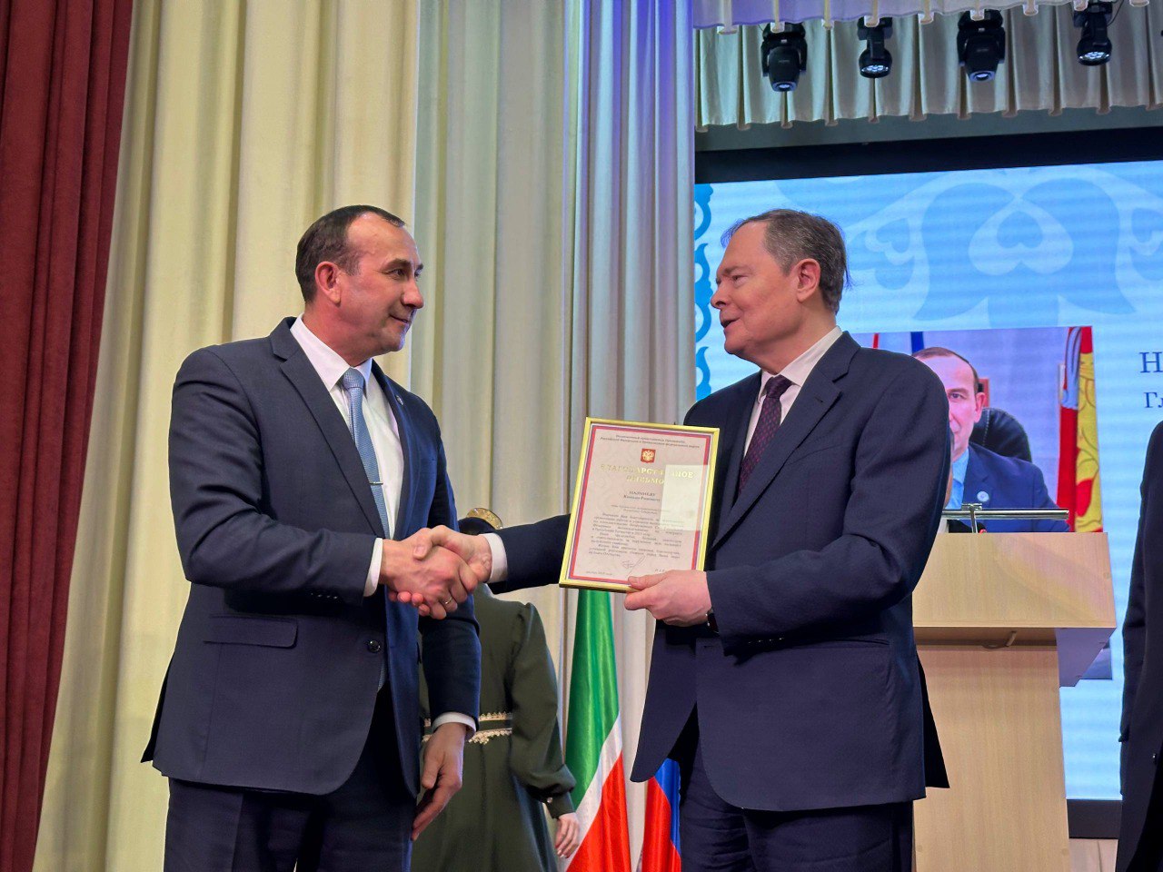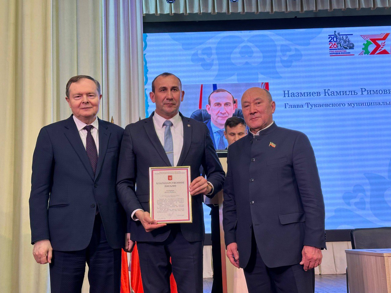 По поручению полномочного представителя Президента Российской Федерации в Приволжском федеральном округе Игоря Комарова главный федеральный инспектор по Республике Татарстан Виктор Демидов вручил главе Тукаевского муниципального района Камилю Назмиеву Благодарность полномочного представителя Президента РФ в ПФО.